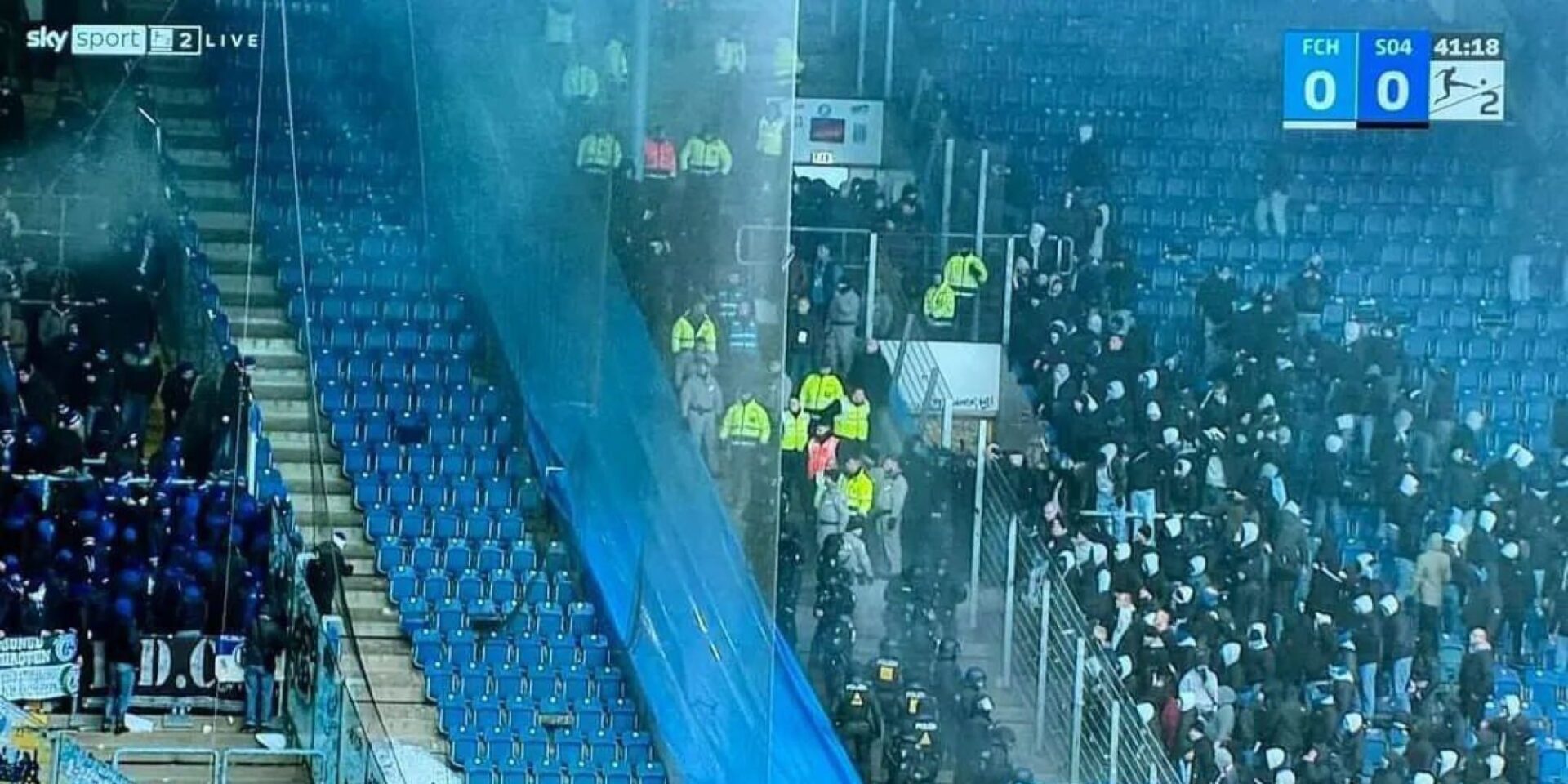 Όλα κυλούσαν ομαλά μέχρι και το 35′ αλλά κάπου εκεί άρχισε η ένταση στη θύρα των φιλοξενούμενων, αφού οι οπαδοί της Σάλκε έσπασαν το πλεξιγκλάς με στόχο να επιτεθούν σε αυτούς της Χάνσα Ρόστοκ. Πριν το κάνουν, όμως, επενέβη η αστυνομία, με αποτέλεσμα οι οπαδοί να επιτεθούν εκεί τελικά.