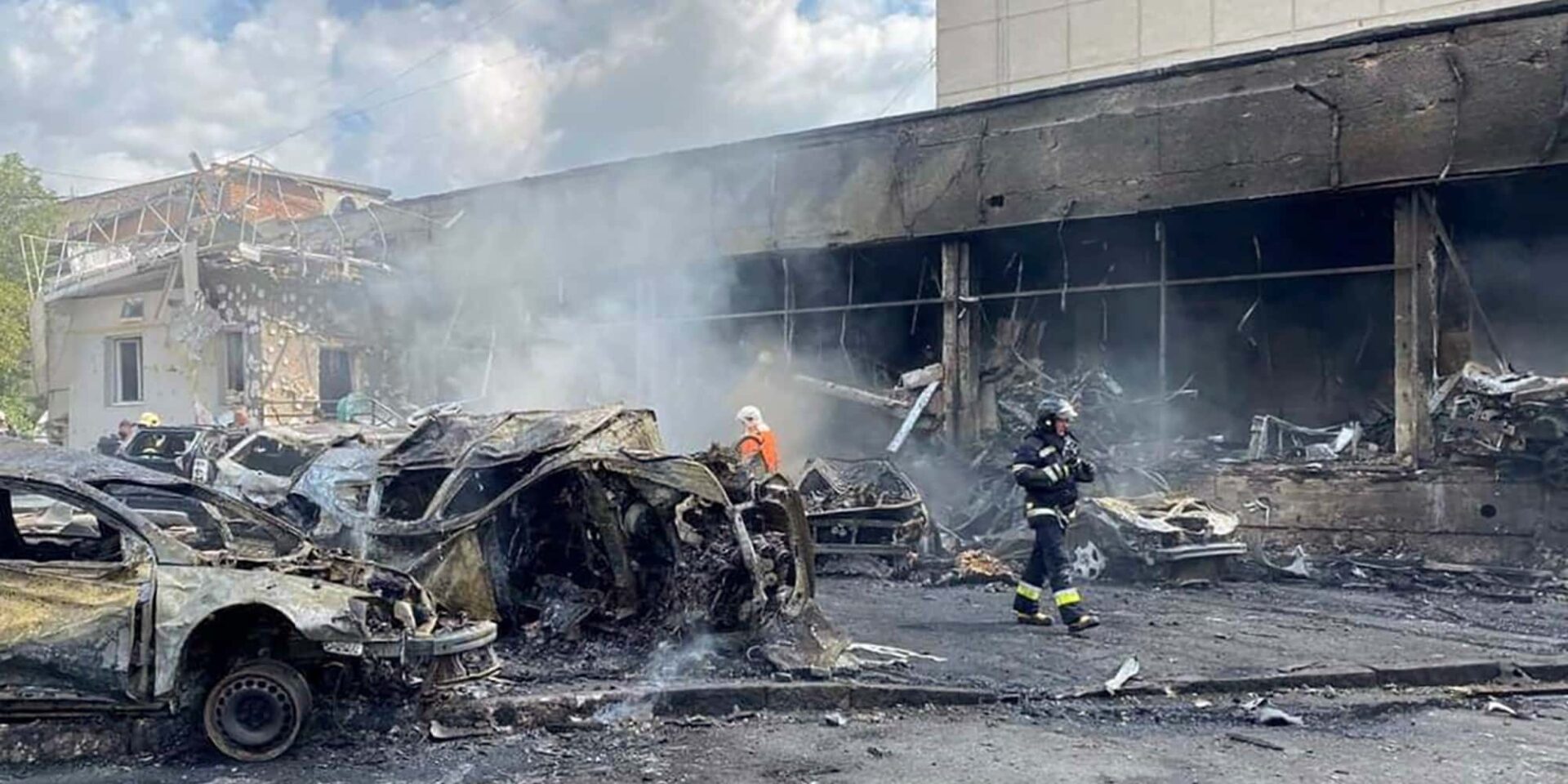 Από το χτύπημα καταστράφηκε ένα διώροφο συγκρότημα κατοικιών, ένα σχολείο και ένα κατάστημα, ενώ μέλη σωστικών συνεργείων έκαναν έρευνες στα χαλάσματα, δήλωσαν ο κυβερνήτης Όλεχ Σινεχούμποφ και η αστυνομία.