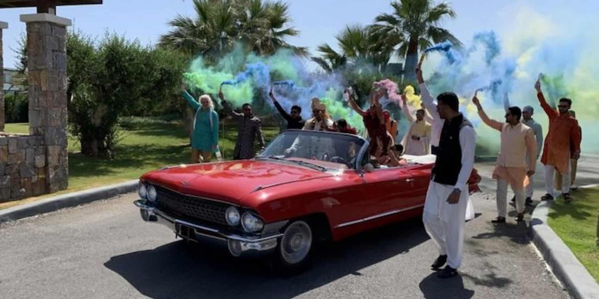 Τον γαμπρό και τη νύφη συνόδεψε ένα πολυτελές κλασικό αυτοκίνητο του 1961 και συγκεκριμένα μια Cabrio Cadillac Eldorado.