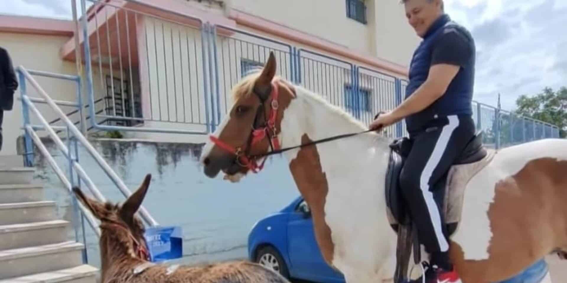Έφιππος πάνω σε ένα άλογο και με τη συνοδεία ενός μικρού γαϊδουριού, προσήλθε στο εκλογικό τμήμα του ο 50χρονος αγρότης Αριστείδης Τσιρίκος για να ασκήσει το εκλογικό του δικαίωμα.