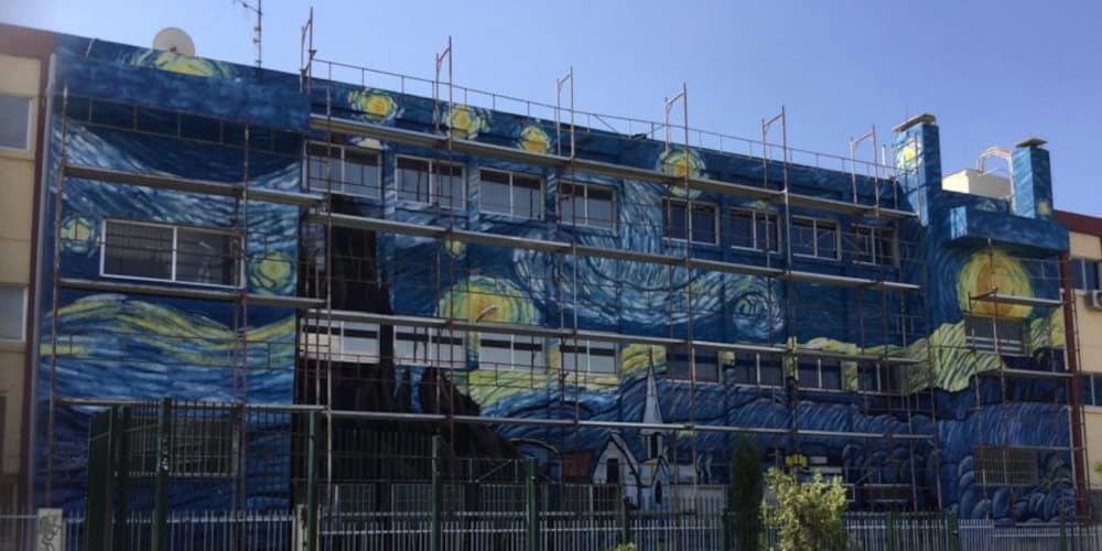 Στην πλευρά που «βλέπει» προς το ανοιχτό θέατρο «Μαίρη Αρώνη», το δίδυμο των Spylex Design δημιούργησαν τον γνωστό πίνακα του Van Gogh «Έναστρη Νύχτα».