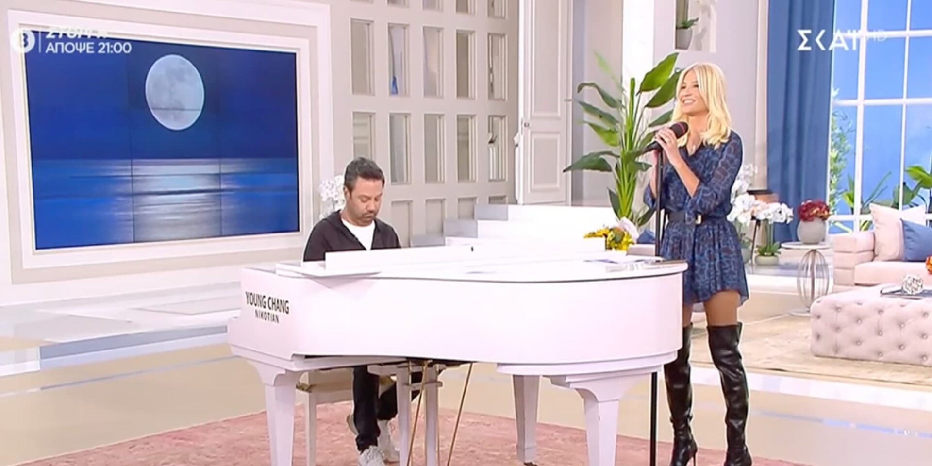 Η παρουσιάστρια ερμήνευσε το «Φεγγάρι μου» της Νατάσσας Θεοδωρίδου με συνοδεία στο πιάνο τον Γιώργο Θεοφάνους.