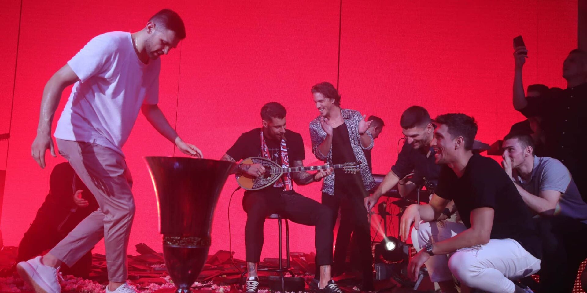 Αφού τραγούδησε το «Περαία μου, με τον Σαρωνικό σου» στο «ερυθρόλευκο» γλέντι υπό τους ήχους του Νίκου Οικονομόπουλου, ο Γιώργος Πρίντεζης ξεσήκωσε το μαγαζί παίζοντας και μπουζούκι.
