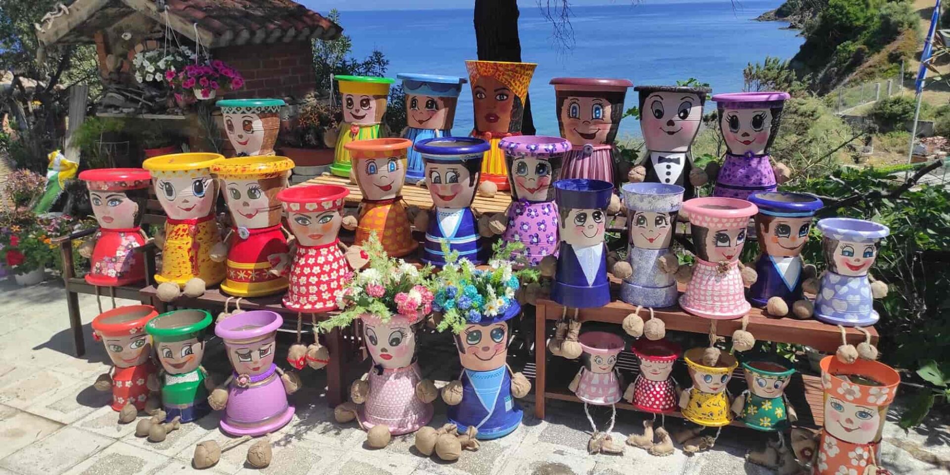 «Ήρθα σε επαφή με την καλλιτέχνιδα Γεωργία Μαρκοπούλου, η οποία διατηρεί εξοχικό στην περιοχή και φτιάξαμε φιγούρες από γλάστρες, τις οποίες πάλι τοποθετήσαμε σε διάφορα σημεία, κυρίως ψηλά, ακόμη και σε ένα μπαλκόνι εγκαταλειμμένου σπιτιού». Μάλιστα, όπως εξηγεί ο κ. Παπαγιάννης, οι 29 γλάστρες – κούκλες απεικονίζουν ντόπιους και κυρίως ηλικιωμένες που θυμάται από την παιδική του ηλικία, όπως τη γιαγιά Ξανθίππη, η οποία δεν ζει πια μαζί με την εγγονή της.