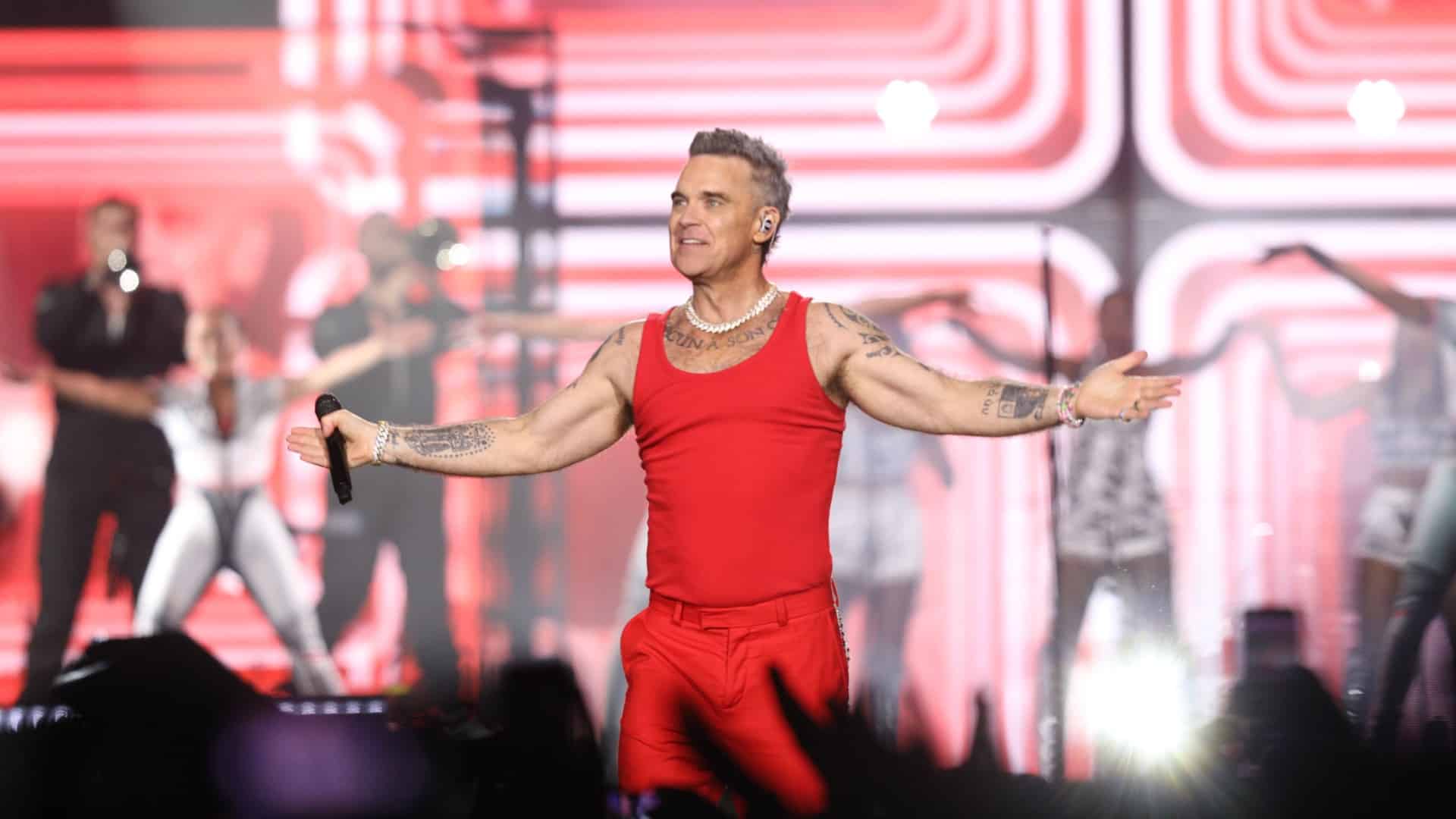 Ντυμένος στα κόκκινα – και όχι μόνο – ο Ρόμπι Γουίλιαμς εμφανίστηκε στο Παναθηναϊκό Στάδιο και απέδειξε ότι ο χρόνος δεν έχει «περάσει από πάνω του».
